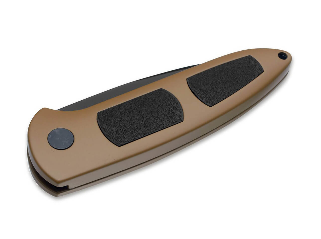 Mit nunmehr 20 Jahren Böker Speedlock blicken wir auf eine einzigartige Erfolgsgeschichte zurück, die einen der Meilensteine in der Geschichte von Böker darstellt. Das leicht bedienbare Speedlock hat sich in beiden erhältlichen Größen und mit der über die Jahrzehnte millionenstarken Auflage eine breite Anhängerschaft gesichert, die vom normalen Taschenmessernutzer über behördliche Nutzer bis hin zu Messersammlern auf der Suche nach dem Besonderen reicht. Das 20-jährige Jubiläum des Böker Speedlock ist Anlass für eine gründliche Renovierung. Ohne das bewährte und ungebrochen beliebte Design zu ändern, haben wir das technische Innenleben des Aluminiumgriffes und die Mechanik umfassend überarbeitet und so die Leistungsfähigkeit und Zuverlässigkeit des Speedlock nochmals deutlich gesteigert. Die Klinge aus CPM S-35VN und der Griff dieser außergewöhnlichen Version sind mit dem besonders widerstandsfähigem ILAFLON® beschichtet. Dieser Stahl wird als optimierte Version des bewährten, ebenfalls pulvermetallurgisch hergestellten S30V gehandelt und wird zusätzlich mit dem Element Niob legiert. Die Einlagen des in der Farbe RAL-8000 gehaltenem Aluminium-Griffkörpers bestehen aus rutschfestem schwarzem Kunststoff und sorgen in Verbindung mit der schwarzen Klinge für ein stimmiges Gesamtbild. Speedlock 2.0 - bereit für die nächsten 20 Jahre!