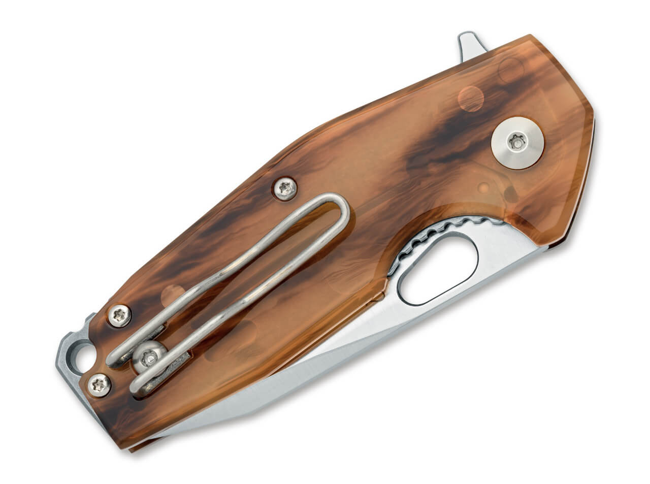 Besonderes Highlight ist der Griff aus braun marmoriertem Celluloseacetat, einem hochwertigen Material aus der Welt exklusiver Brillenfassungen. Seine Tiefe, Struktur und Lichtwirkung verleihen dem Messer eine edle, fast schon abendliche Anmutung, ohne dabei an Funktionalität einzubüßen. Ein umsetzbarer Drahtclip ermöglicht diskretes Tip-up-Tragen, während die integrierte Fangriemenöse zusätzliche Trageoptionen eröffnet.