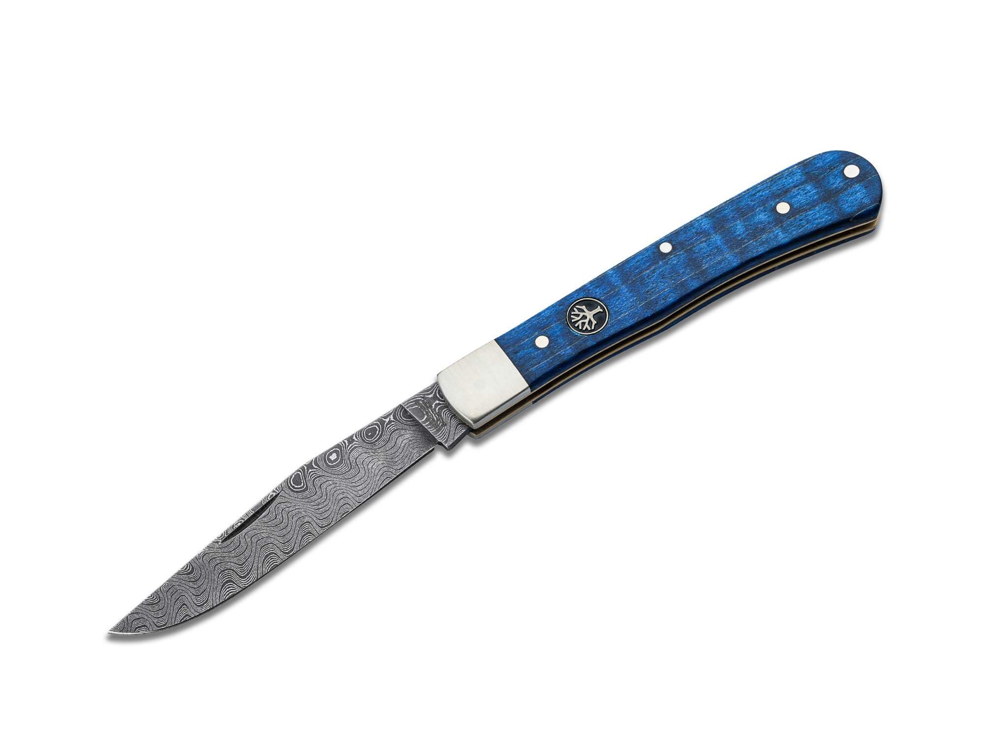 Diese atemberaubende und weltweit auf 30 Exemplare streng limitierte Variante des Böker Trapper Uno verzaubert Messerliebhaber mit einer von Chad Nichols handgeschmiedeten Damast-Klinge mit 200 Lagen im Muster „Riple“ sowie himmelblauen Griffschalen aus Riegelahorn, die von Backen aus Neusilber eingefasst werden. Das Zweihandmesser wird klassisch über den Nagelhau geöffnet und verriegelt nicht. Die Auslieferung des komplett von Hand in der Böker Manufaktur Solingen gefertigten Slipjoint-Messers erfolgt mit einemhochwertigen Filz-Etui.