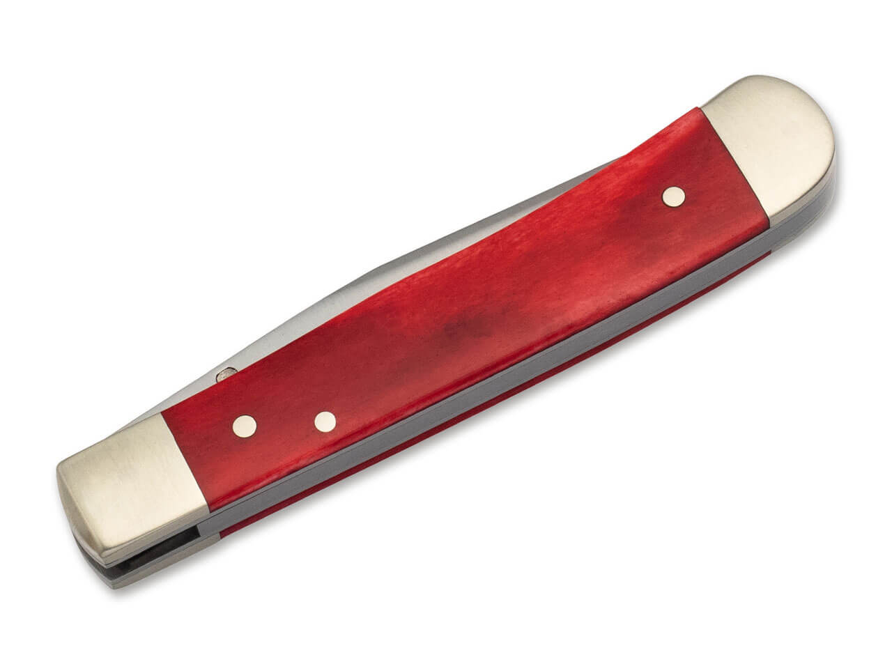 Das klassische Böker Trapperliner verbindet die bereits von den amerikanischen Waldläufern verwendete Bauform des Trappers mit der modernen Verriegelung per Linerlock. Die klassische Beschalung aus rot gefärbtem Knochen und die edlen Backen aus Neusilber beherbergen die satinierte Klinge aus rostfreiem, eisgehärtetem 4034, die per Daumenpin geöffnet wird. Ein schlankes, elegantes Taschenmesser für jede Gelegenheit. Mit hochwertigem Filz-Etui zur Aufbewahrung. Handgefertigt in der Böker Messer-Manufaktur Solingen.